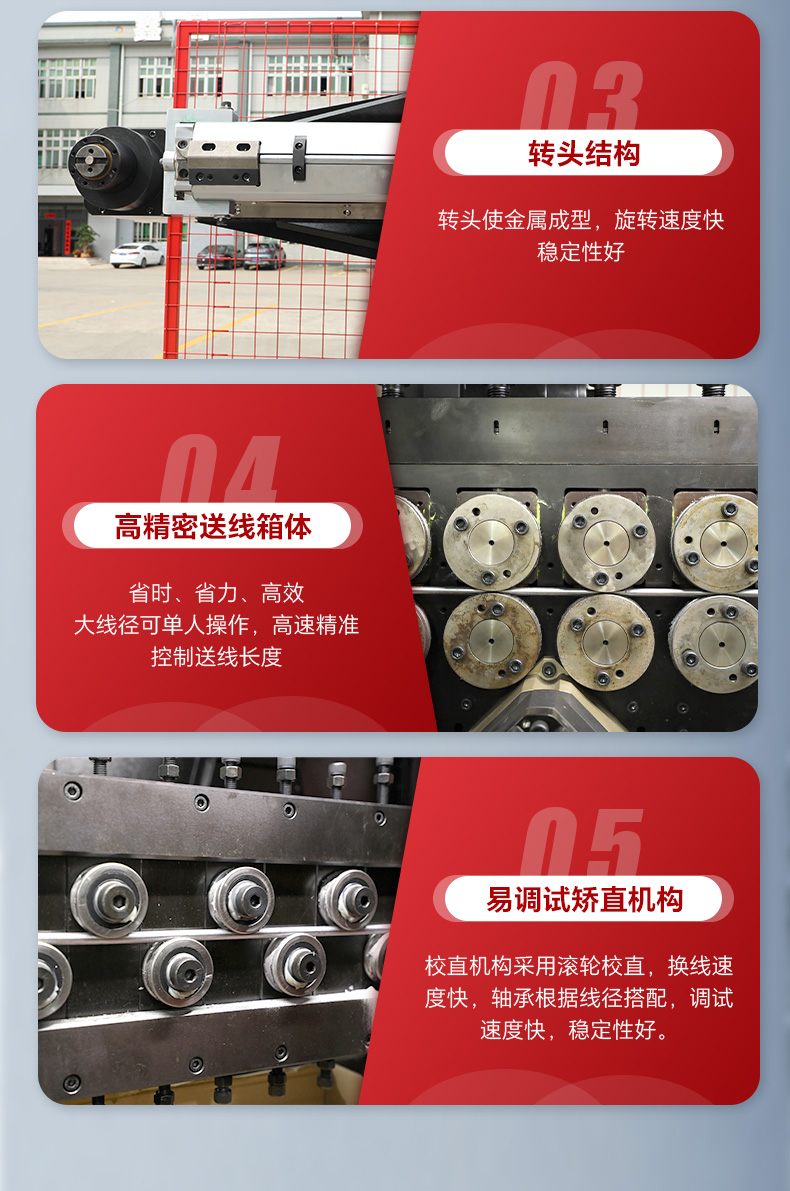 產(chǎn)品特點(diǎn):適用于生產(chǎn)汽車零部件、汽車門鎖拉桿、工藝品金屬線、廚具餐具支架、倉(cāng)儲(chǔ)籠、超市貨架、手推車等線材成型產(chǎn)品;轉(zhuǎn)頭與送線完全分離,真正可實(shí)現(xiàn)轉(zhuǎn)頭時(shí)不轉(zhuǎn)線,確保送線靈活而且穩(wěn)定性高。