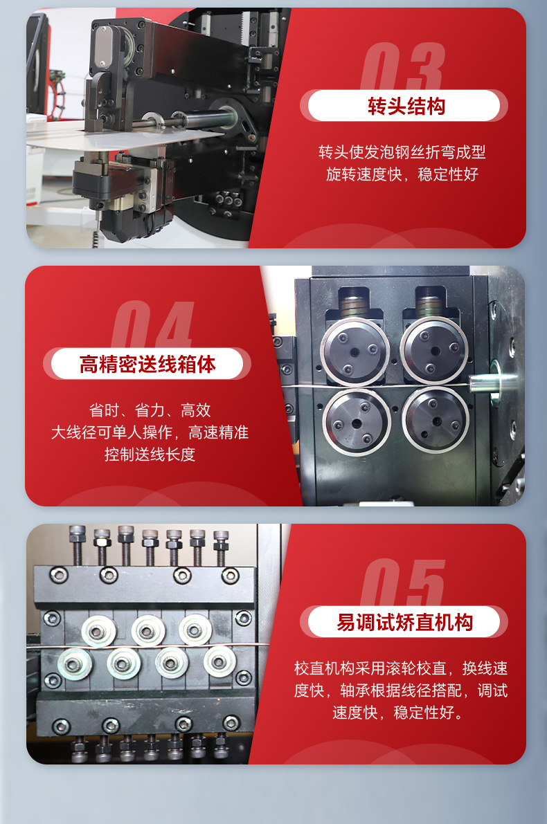 產(chǎn)品特點(diǎn):調(diào)試和切換產(chǎn)品更方便,無(wú)需頻繁更換工裝夾具,成形空間更靈活;產(chǎn)品通過(guò)頭部旋轉(zhuǎn)成型產(chǎn)品,可成型100-600mm長(zhǎng)鋼絲件及不對(duì)稱產(chǎn)品(汽車發(fā)泡鋼絲);頭部旋轉(zhuǎn)設(shè)計(jì)根據(jù)產(chǎn)品特定,可靈活高速旋轉(zhuǎn),提高產(chǎn)品生產(chǎn)效率。