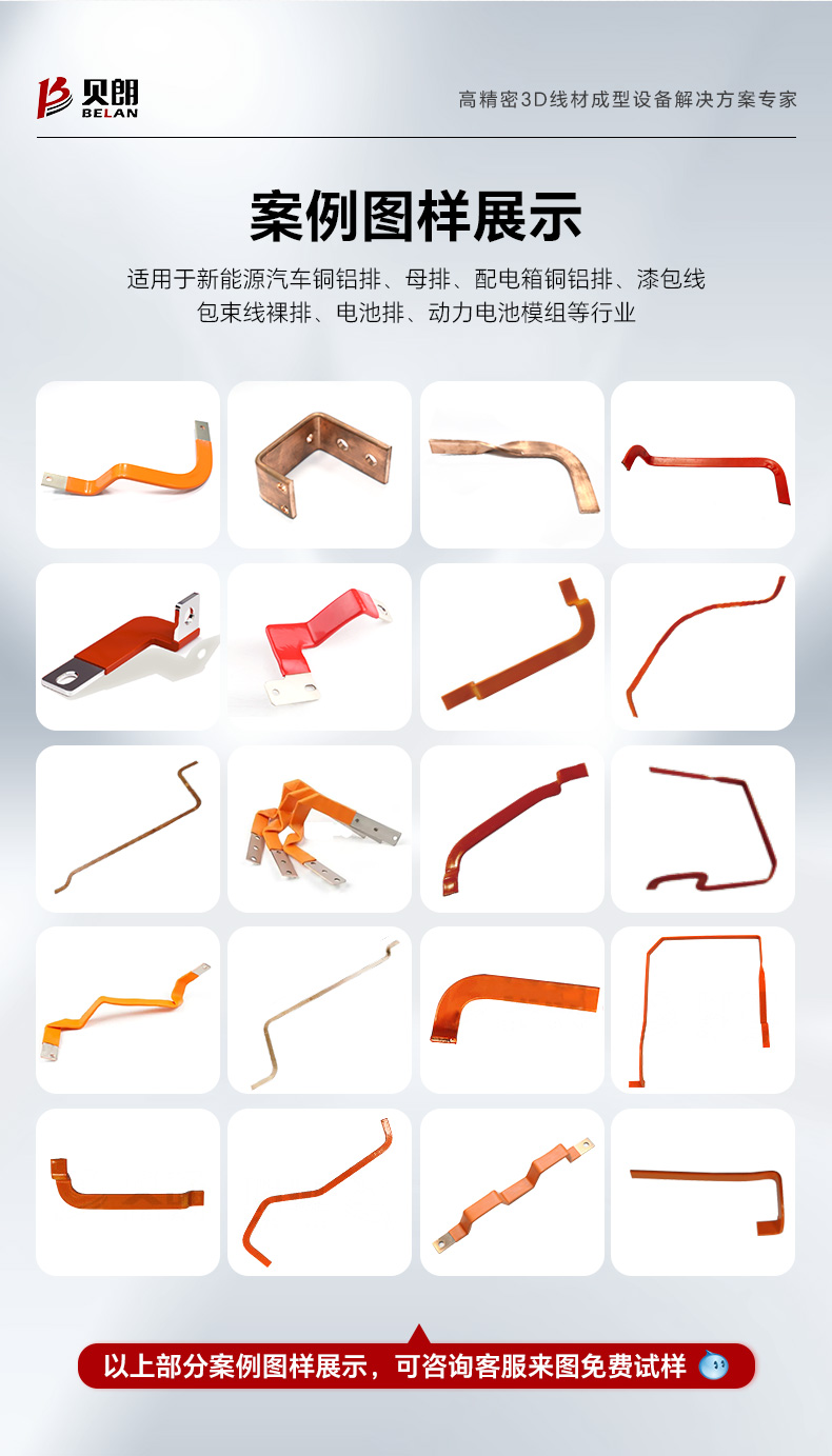 8、該設(shè)備是專(zhuān)門(mén)針對(duì)銅、鋁排自動(dòng)折彎成型的一款設(shè)備,適用于生產(chǎn):新能源汽車(chē)銅鋁排、母排、配電箱銅鋁排、