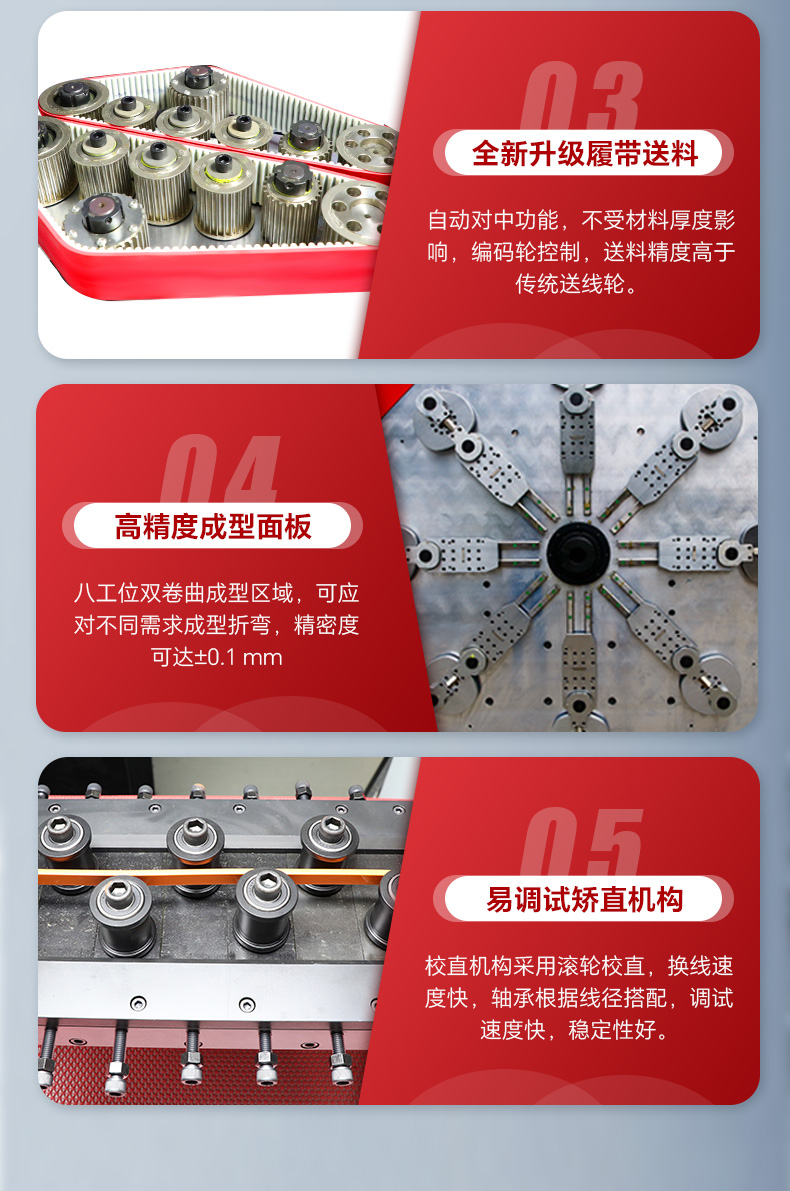 2.設(shè)備采用履帶送料,代替?zhèn)鹘y(tǒng)送線輪,更換線徑時(shí),無需更換送線輪。
